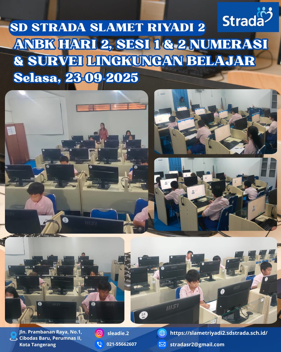 Pada tanggal 23–24 September 2025, peserta didik kelas 5 SD Strada Slamet Riyadi 2 melaksanakan kegiatan Asesmen Nasional Berbasis Komputer (ANBK) di laboratorium komputer sekolah. Kegiatan ini berlangsung dengan tertib, lancar, dan penuh semangat sesuai dengan jadwal yang telah ditetapkan oleh Kementerian Pendidikan, Kebudayaan, Riset, dan Teknologi. ANBK merupakan program evaluasi pendidikan nasional yang bertujuan untuk mengukur kompetensi dasar peserta didik dalam literasi membaca, numerasi, serta survey karakter dan survei lingkungan belajar.
